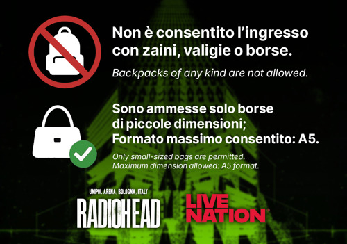 Tutti gli elementi di dimensioni superiori non avranno accesso al venue e dovranno essere lasciati obbligatoriamente al guardaroba