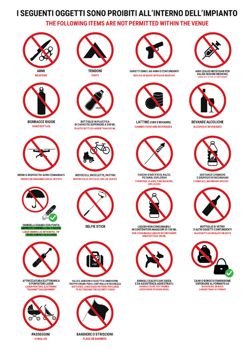 Lo staff addetto alla sicurezza si riserva il diritto di effettuare controlli ed eventualmente vietare l’ingresso nella venue di tutti quegli oggetti che riterrà inadeguati e pericolosi, anche se non espressamente indicati in questo elenco.